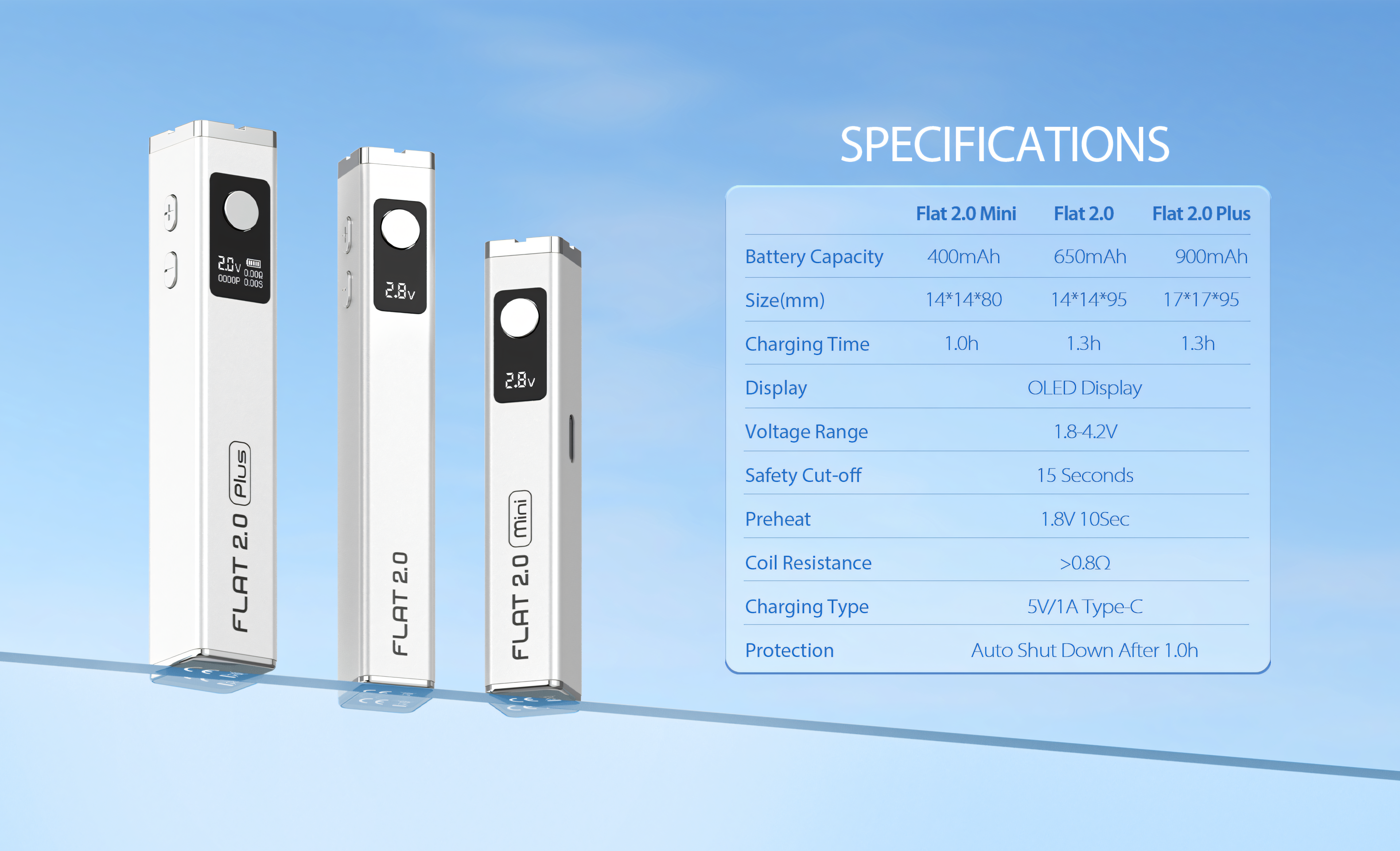 The Yocan Flat 2.0 series offers key features including precise digital voltage adjustment from 1.8V to 4.2V, a 10-second preheat function, an integrated 999-puff counter, and an automatic 1.0-hour (60-minute) safety shutdown for enhanced control and convenience.